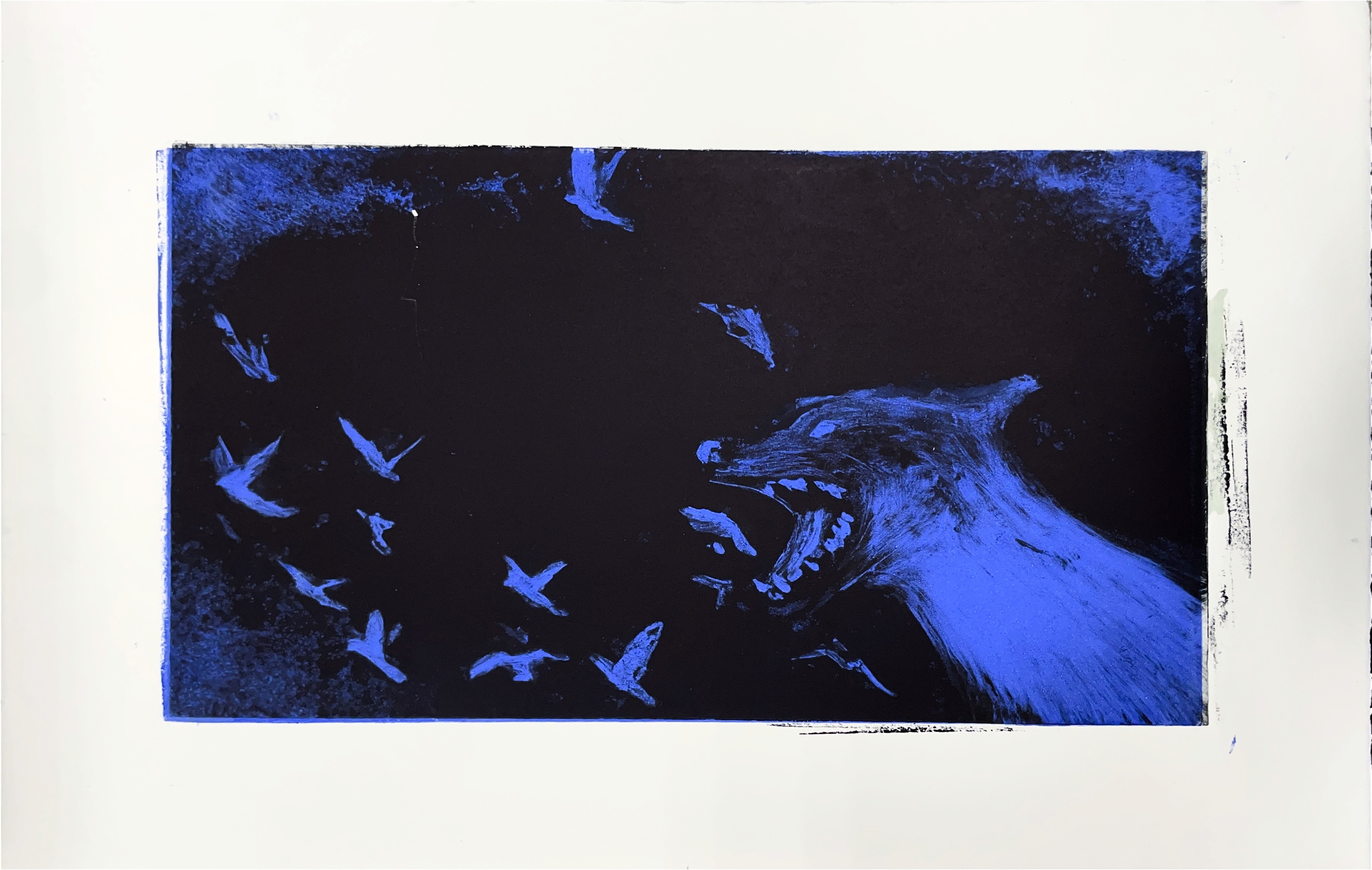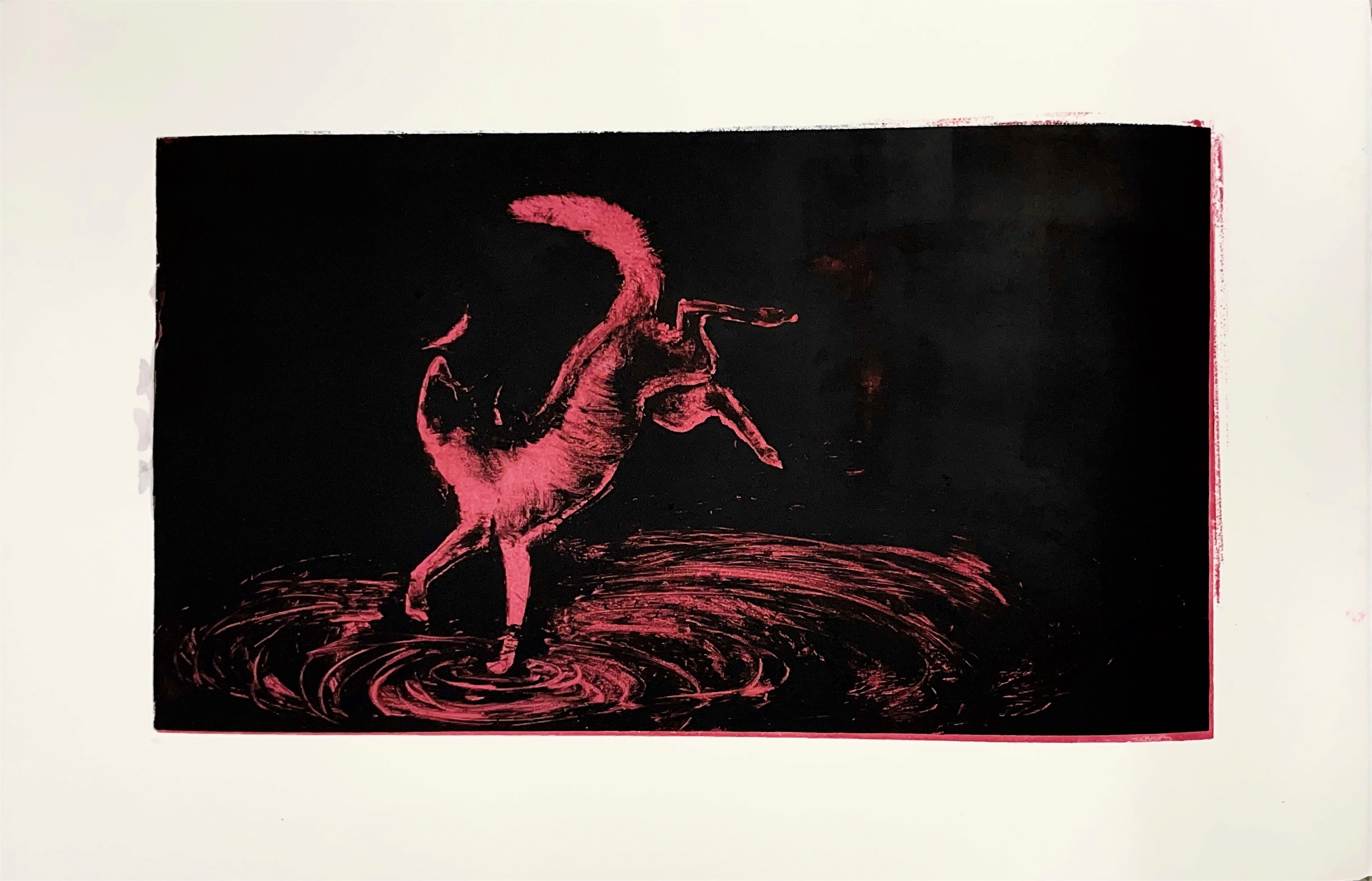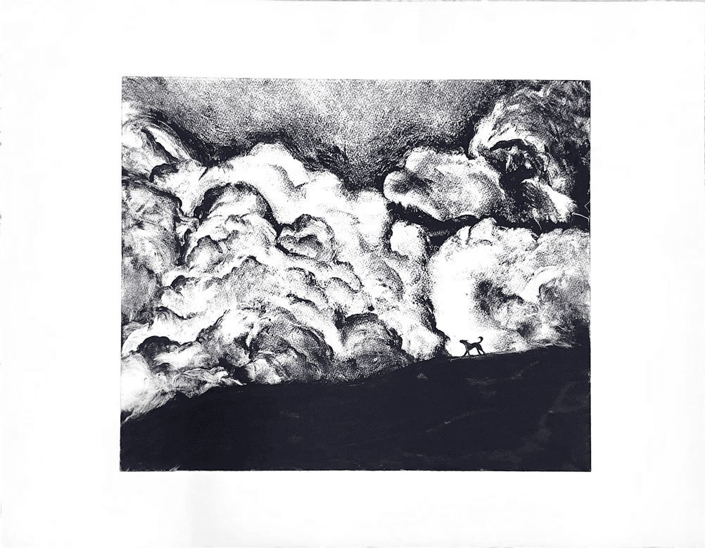 Each print captures a creature in a fleeting moment, caught between shadow and illumination, gestures that feel both wild and deeply familiar. Through layered ink, blurred motion, and dramatic tonal contrasts, the works invite viewers to see animals not as subjects of observation, but as mirrors of our own internal states.