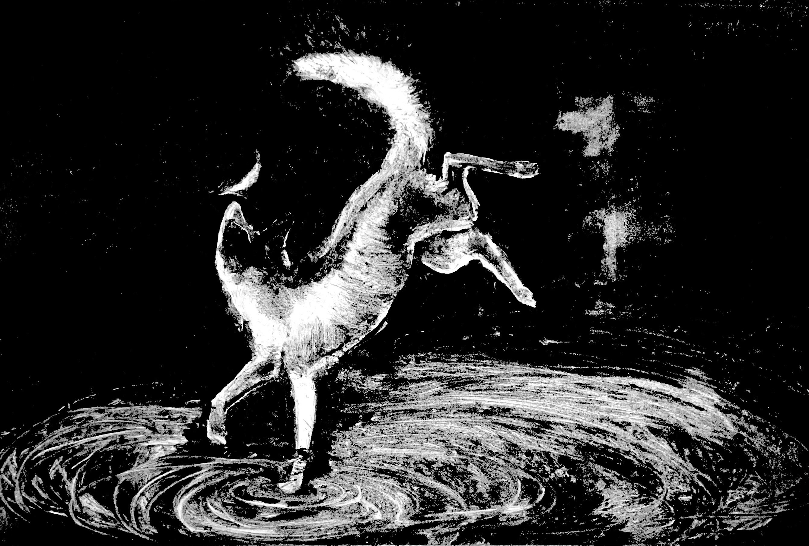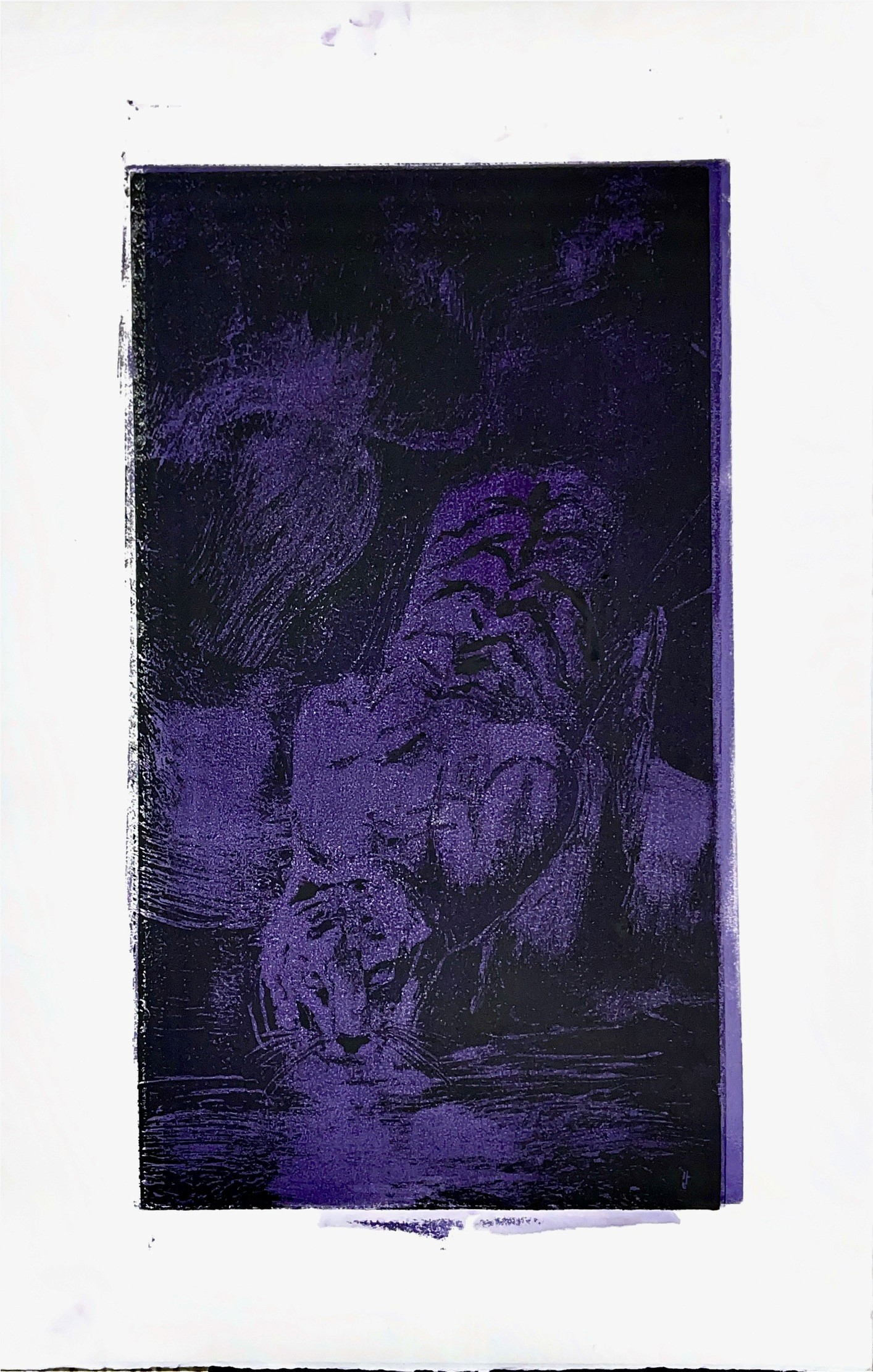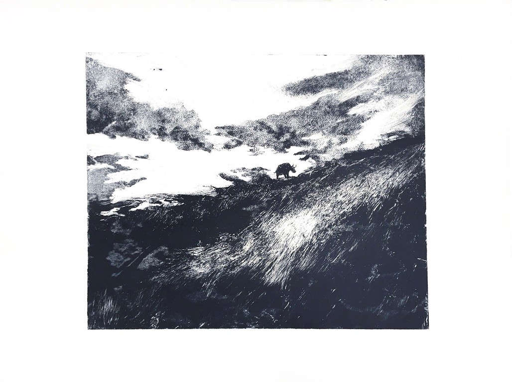 Each print captures a creature in a fleeting moment, caught between shadow and illumination, gestures that feel both wild and deeply familiar. Through layered ink, blurred motion, and dramatic tonal contrasts, the works invite viewers to see animals not as subjects of observation, but as mirrors of our own internal states.